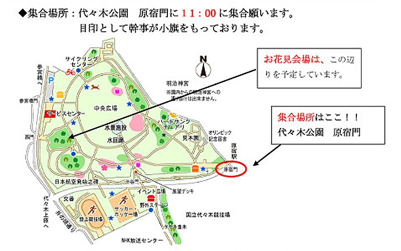 | 集合場所 | 代々木公園 原宿門に11:30に集合願います。 目印として幹事が小旗をもっております。 |